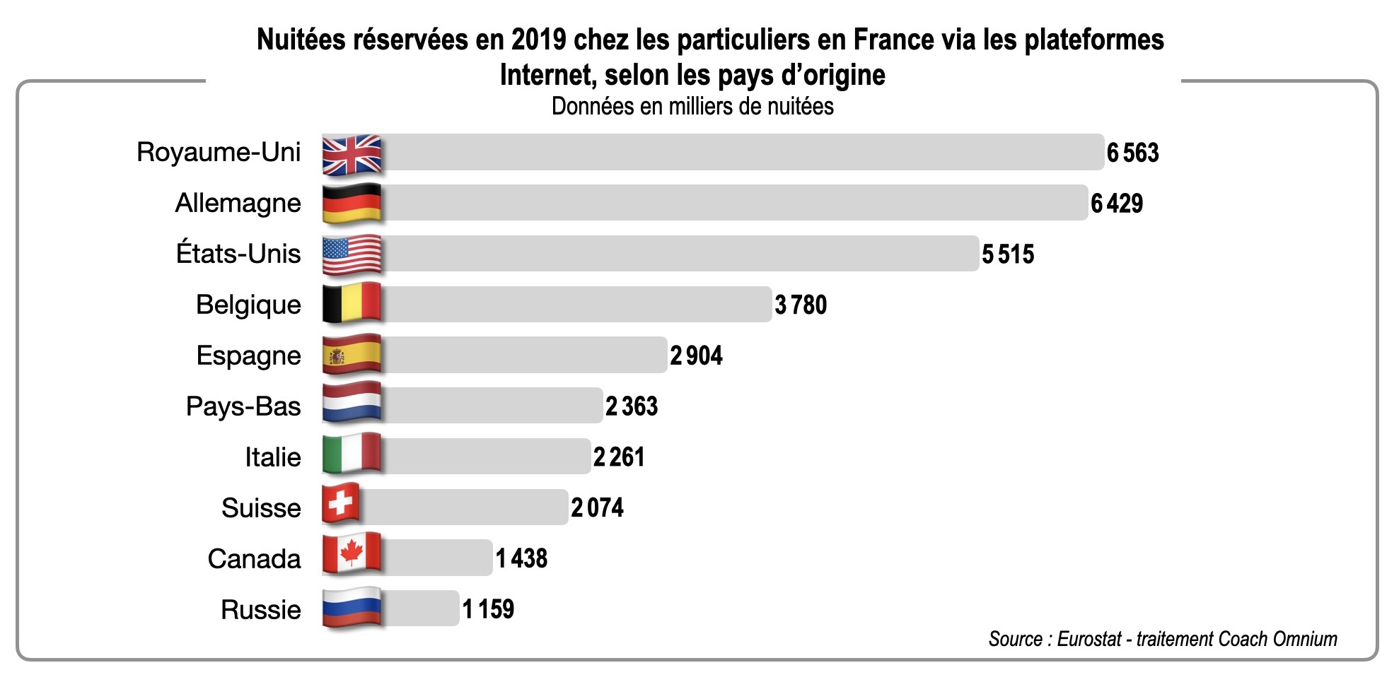 Pour la France, près de 6 touristes sur 10 hébergés dans ce mode d’hébergement chez les particuliers sont originaires de l’Hexagone. Avec cependant des variations très importantes selon les villes. La clientèle étrangère y opte plus fortement pour l’hôtellerie, les campings, les villages de vacances et les résidences. Toujours en France, en 2019, les Britanniques, les Allemands et les Nord-Américains formaient le podium des premières nationalités dans les logements des particuliers, avec à eux trois plus de 18 millions des nuitées, soit 39 % des nuitées étrangères.