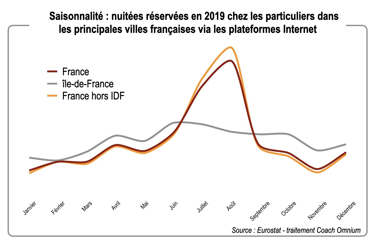La forte fréquentation des zones littorales se traduit naturellement par une saisonnalité marquée des nuitées réservées via des plateformes : en 2019, en France comme dans l’Union Européenne, plus du tiers des nuitées passées dans ces hébergements ont lieu en juillet et août. À titre de comparaison, les nuitées dans les hôtels français de juillet et août 2019 représentent 22 % de l’ensemble de l’année.