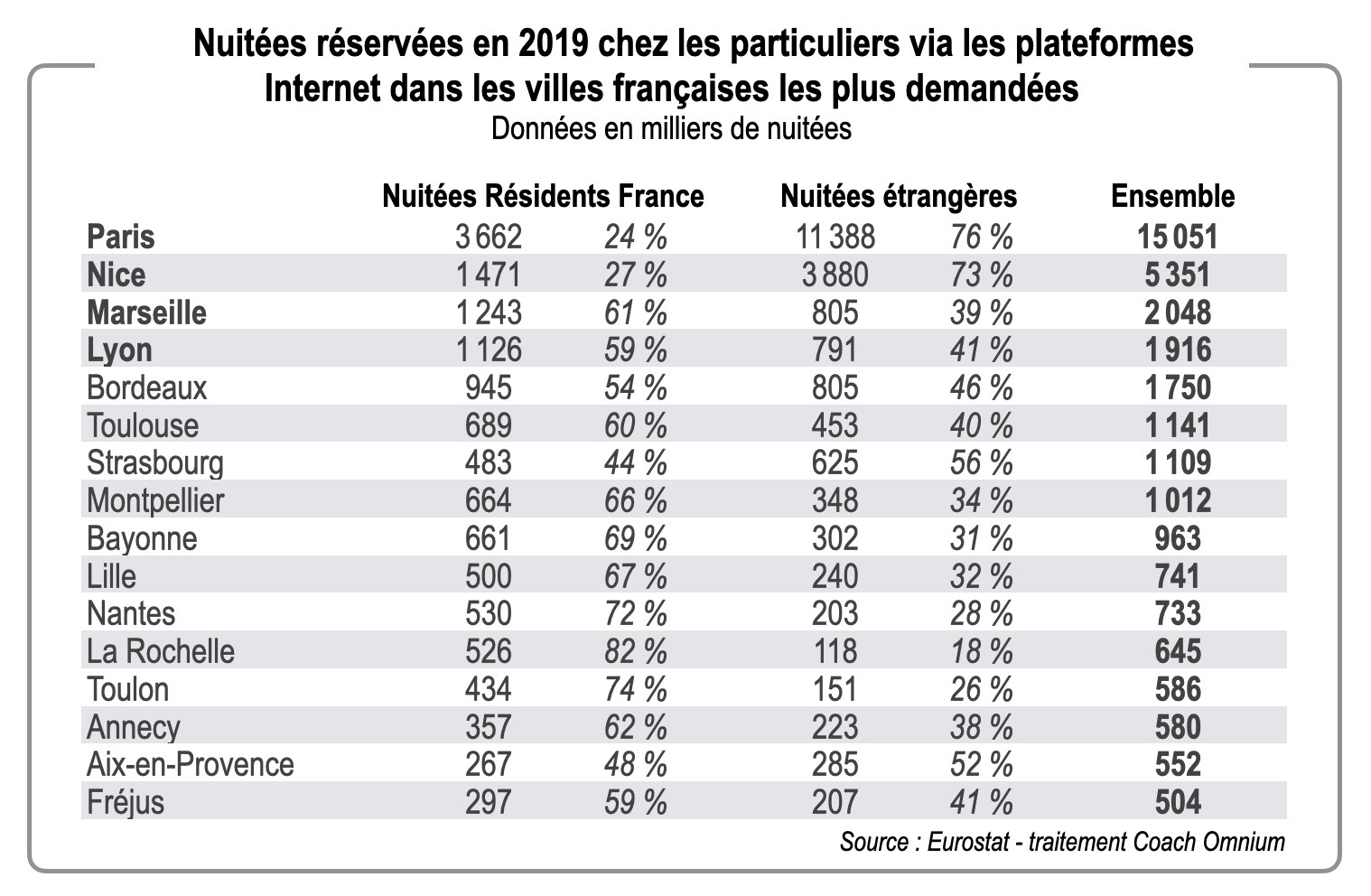 Au niveau des premières villes françaises les plus demandées par les touristes pour se loger chez des particuliers en 2019, Paris détenait sans surprise le leadership. C’étaient 15 millions de nuitées, dont 76 % provenant de visiteurs étrangers. Avec trois fois moins de nuitées, Nice se range à la deuxième place, suivie de Marseille (2 millions de nuitées).