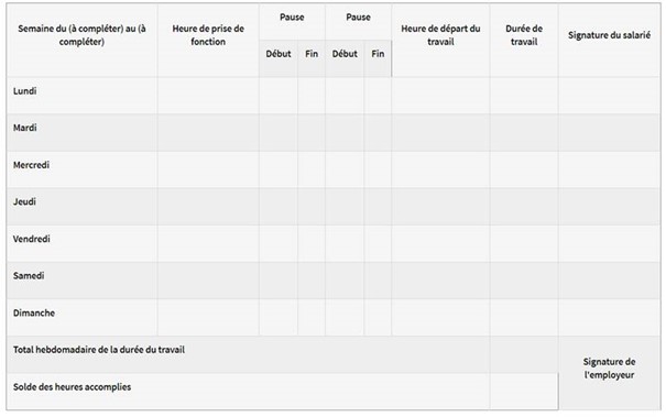 - Chaque semaine, par récapitulation, selon tous moyens, du nombre d’heures de travail effectuées par chaque salarié. Ce document doit être émargé par le salarié et par l’employeur. Il est tenu à la disposition de l’inspection du travail.