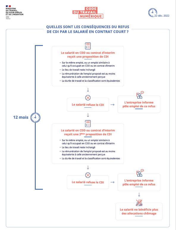 Si le salarié refuse la proposition de CDI, elle devra en informer France Travail dans un délai d’un mois.