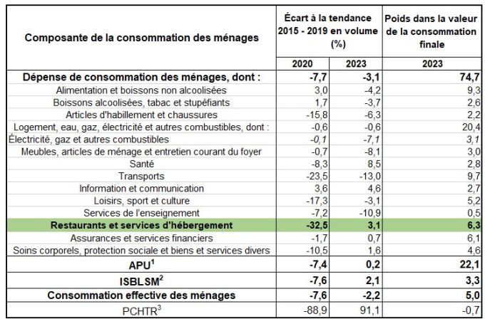Lecture : En 2020, la dépense de consommation finale des ménages en Restaurants et services d’hébergement est inférieure de 32,5 % en volume au niveau qui est obtenu en prolongeant la tendance observée entre 2015 et 2019 au point 2020. En 2023, elle est supérieure à cette même tendance prolongée (+3,1 %).