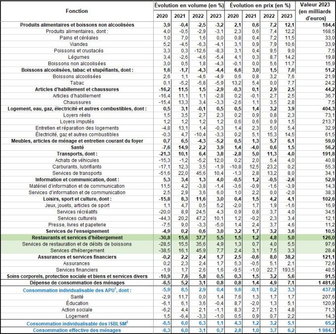 En les distinguant, les dépenses en services de restauration et de débits de boissons progressent de 4,9 % et celles en services d’hébergement augmentent de 7,7 % (après respectivement +35,6 % et +45,9 % en 2022).