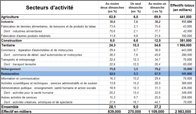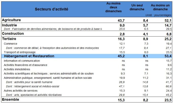 Aucun secteur privé, y compris l’Agriculture (52,1%), ne mobilise le dimanche un pourcentage aussi élevé d’actifs que l’Hébergement Restauration (53,4%).