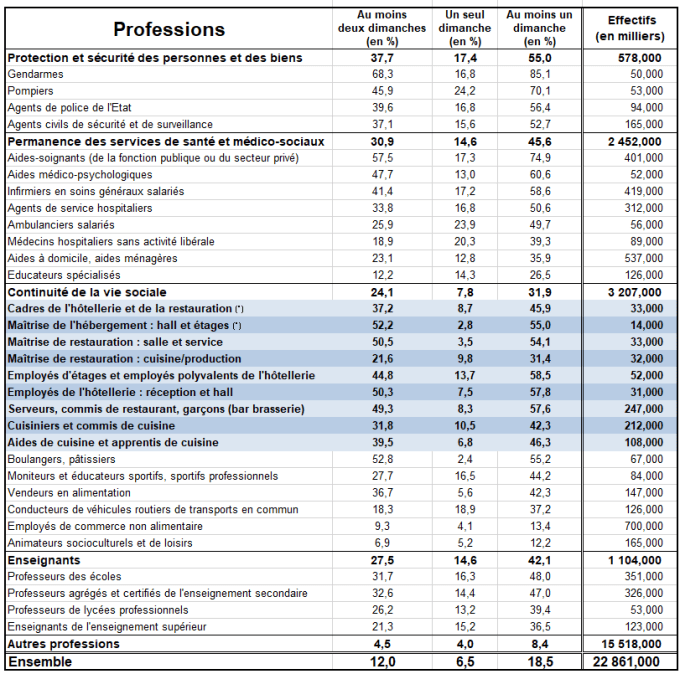 Cadres, agents de maîtrise, réceptionniste, cuisinier, serveur. Dans la grande majorité de ces catégories et de ces métiers, au moins près de la moitié des actifs en emploi travaillent au minimum un dimanche par mois.