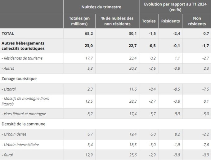 - Lecture : Dans les résidences, le nombre de nuitées non-résidentes est inférieur de 1,7 % à celui du premier trimestre 2024.