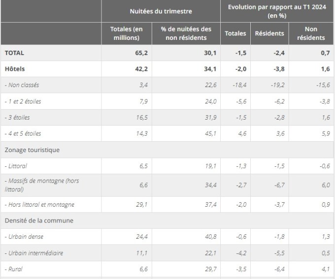 - Lecture : Dans les hôtels du littoral, le nombre de nuitées résidentes est inférieur de 1,5 % à celui du premier trimestre 2024.