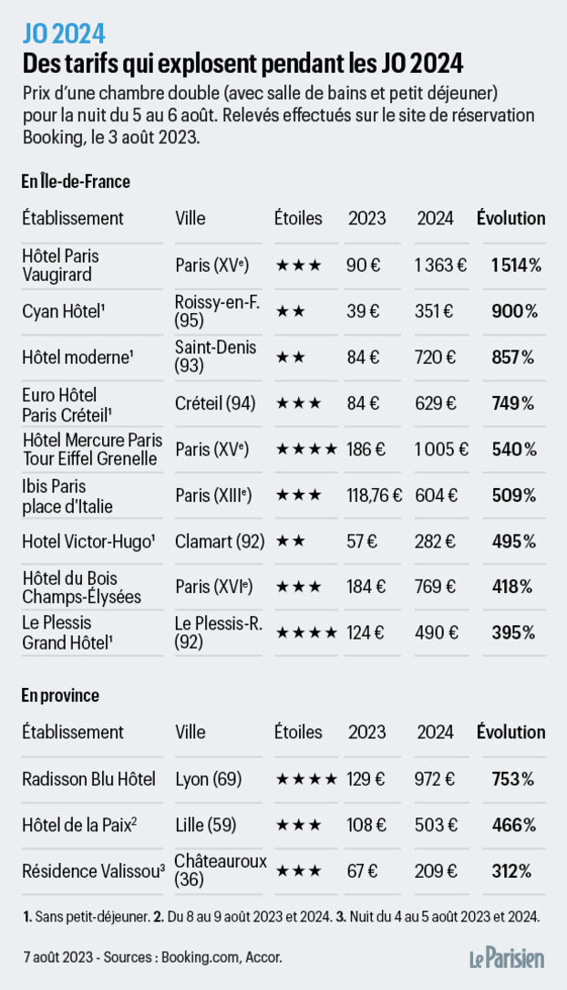 D’après le relevé que nous avons effectué auprès de douze établissements sélectionnés aléatoirement, en Île-de-France et en région près des lieux de compétition, les tarifs entre cet été et août prochain sont multipliés en moyenne par plus de six.