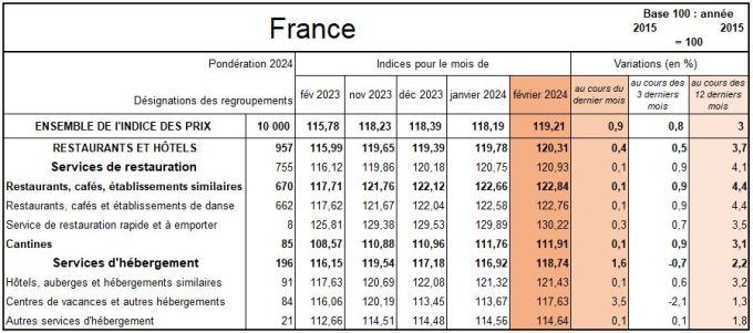 Pour le quatrième mois consécutif, la hausse des prix de ses services a décéléré. En rythme annuel, elle passe ainsi de +4,5% en novembre à +4 % en décembre 2023 puis de +3,9 % en janvier à +3,7 % en février 2024. La décélération la plus notable provient de la Restauration (+4,1 % après +4,5 %). Alors que l’indice de l’Hébergement remonte légèrement de +2,1 % à +2,2 % en raison des hausses saisonnières dans les résidences de tourisme et les villages de vacances. Toutefois, leur hausse sur 12 mois demeure structurellement inférieure à celle des hôtels (+1,3 % vs +3,2%)