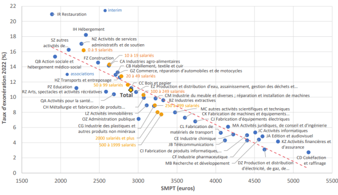 Dans les secteurs ayant fortement recours à de la main d’œuvre à bas salaires, comme la Restauration, l’Hébergement et l’Intérim, le taux d’exonération affiche des niveaux (supérieurs à 18 %) très au-dessus du taux moyen (10,9 %. Ce sont les secteurs qui ont les Salaires Moyens par Tête (SMPT) les plus bas : entre 1 888 € et 2 621 €.