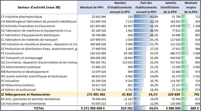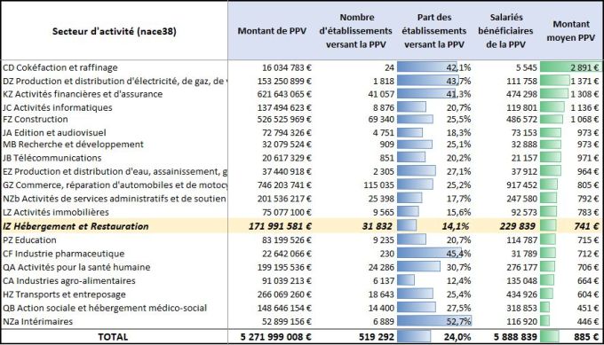 - Le taux d’établissements versant la PPV est plus élevé dans l’Hébergement (> 20 %, estimation HR-infos)
