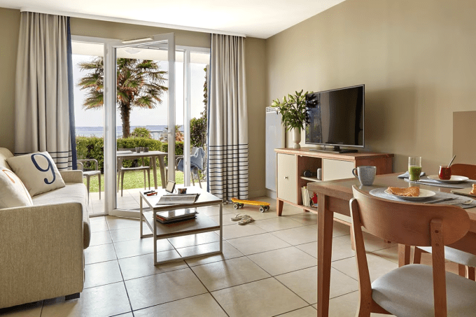 Vue d’un appartement rénové de 37m2 de la résidence premium Pierre & Vacances Le Coteau et la Mer ( avec vue mer (37 m2), à Tréboul (Finistère), sur la baie de Douarnenez. Dans les résidences que le groupe a rénovées, la progression de la fréquentation a été plus élevée.