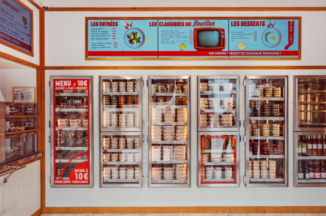 18 Boulevard de Clichy, à quatre numéros de la table XXL de Bouillon Service, un libre-service de vente à emporter lui fait désormais écho, reprenant ses carreaux blancs, ses ceinturages de chêne, ses tonalités rouge tomate et son terrazzo ; signé Lafond AD. Soit, au sous-sol, 90m2 de boulangerie et, au rez-de-chaussée, 20 mètres linéaires de vitrines froides, tempérées ou chaudes où s’affichent, au gré de réapprovisionnements permanents, une offre petit-déjeuner (ficelles au beurre demi-sel, nature (0,80€), avec cacao ou confiture (1€) ; pains au chocolat (1€) ; croissants (1€) ; des sandwichs baguette Tradition (le jambon-beurre-cantal (6€), au poulet façon « César » (6€), ou, chauds, aux canard confit, sauce au fromage frais, pesto d’ail des ours et pommes sautées (8€). On retrouve aussi les plats signatures Bouillon, des œufs mayonnaise (2,70€) aux coquillettes au jambon, truffe d’été (9,50€), sans oublier la saucisse au couteau, purée (8,80€). De 8h30h à 23h (3h, les jeudi, vendredi et samedi, uniquement pour le click & collect et Deliveroo), 7 jours sur 7.