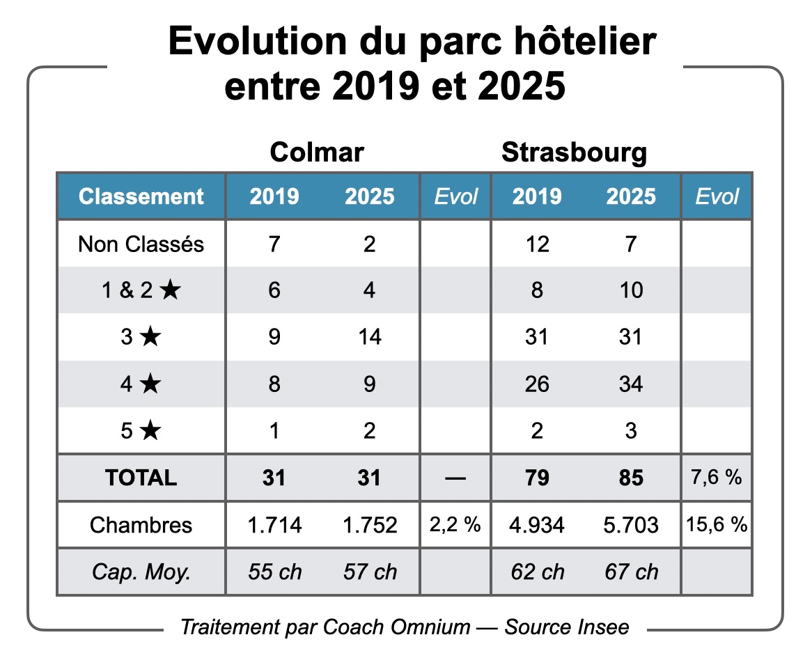 Du côté du parc hôtelier, on compte 538 hôtels en Alsace en 2025, contre 567 en 2019 (avant le Covid), soit -29 adresses (-5 %). Focalisé sur Colmar, c’est la même quantité d’établissements depuis 6 ans, alors qu’à Strasbourg (sans sa périphérie), l’offre a augmenté de 6 unités (+7,6 %), mais avec 15,6 % de chambres en plus (voir tableau) car les hôtels sont plus grands.