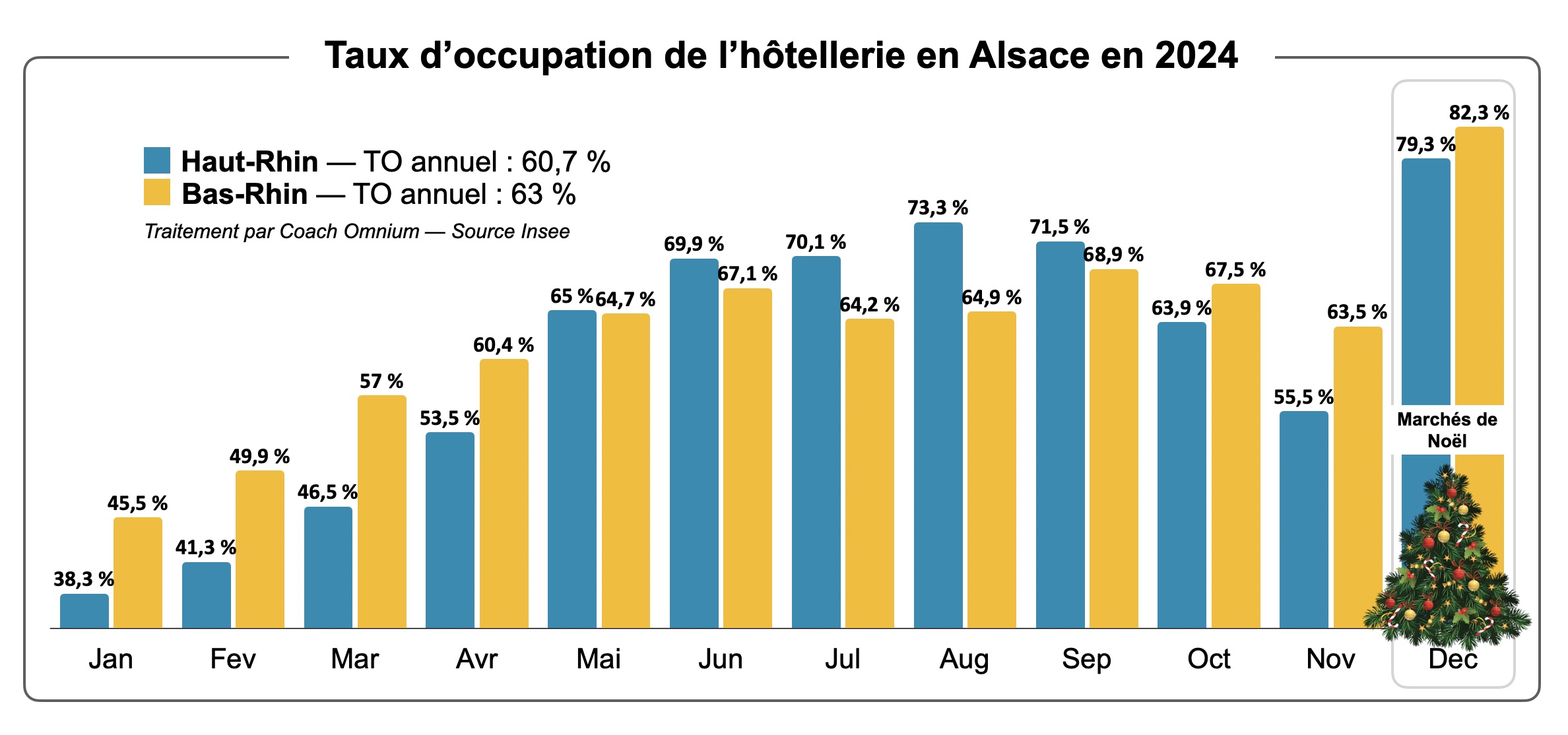 Chaque année en décembre, leurs scores de remplissage sont insolents. Si les hôtels du Haut-Rhin ont réalisé 60,7 % de taux d’occupation en 2024, c’était 79,3 % le dernier mois de l’année. Alors même que toutes les destinations n’ont pas de marché de Noël, on peut loger loin pour les visiter. Même chose dans le Bas-Rhin : 63 % contre 82,3 % en décembre (voire graphique). À Strasbourg, certains établissements flirtent avec 95 % de taux d’occupation ce mois-là !
