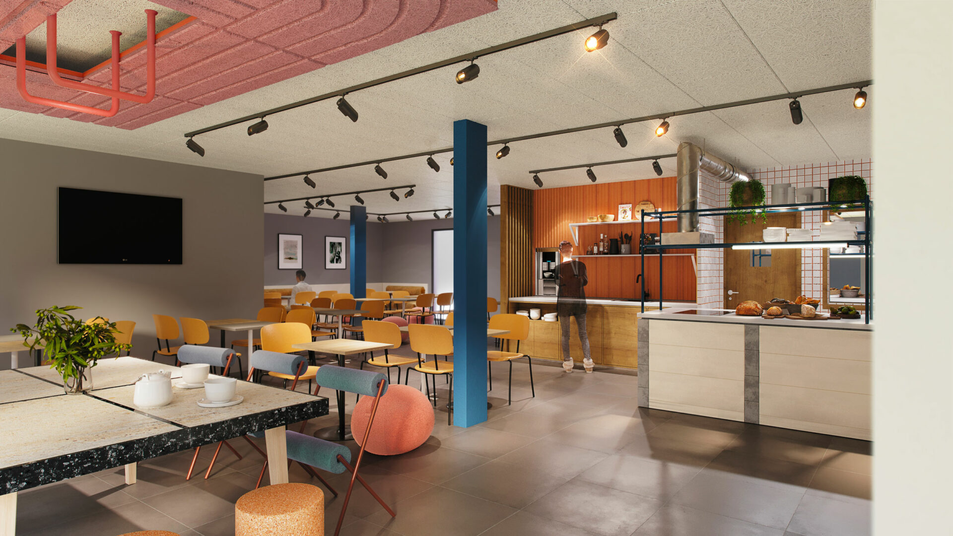 Une caractéristique centrale de notre projet est la table de ping-pong du concept Reboost, autour de laquelle nous avons disposé 8 places assises. Cet espace polyvalent permettra aux clients de s’amuser, de prendre leur petit-déjeuner ou même de travailler, créant ainsi une ambiance dynamique et conviviale. Nous avons également intégré 12 jumps box, marqueurs du concept, qui serviront de sièges supplémentaires. Ces éléments apportent une touche d’originalité et d’interaction dans l’espace.