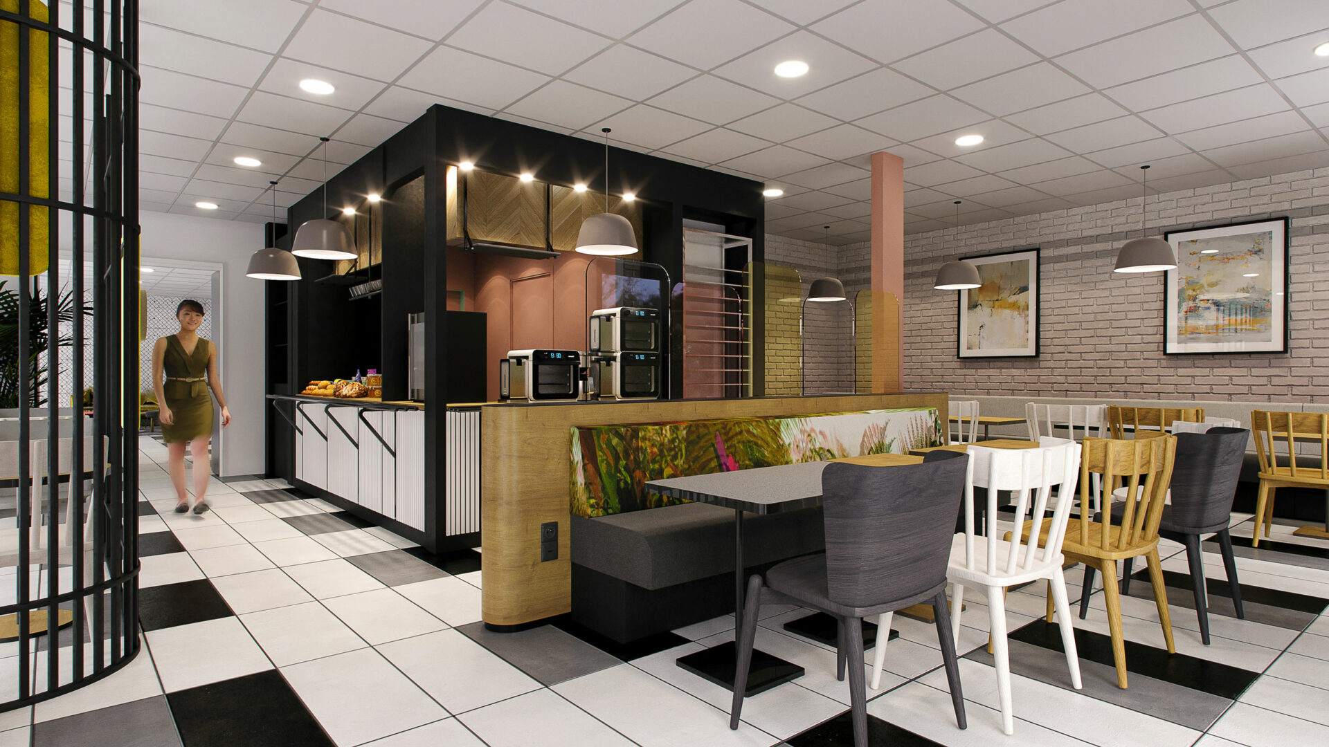Dès leur arrivée, les convives seront accueillis par une ambiance rafraîchissante grâce aux tonalités vert pastel. Le papier peint effet bois apporte quant à lui une touche chaleureuse et confortable au lobby.