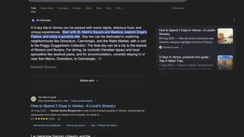En revanche, si vous tapez une requête comme « que faire à Venise en 3 jours, où manger et où dormir », il est fort probable que le premier résultat soit une réponse générée par l’IA, avec des suggestions et des liens pour approfondir.