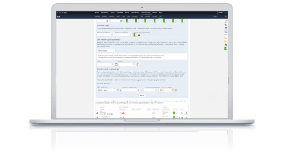 En plus de ceux-ci, il existe deux autres paramètres avancés et optionnels : la fenêtre temporelle, qui définit la durée de validité de la règle dans le temps ; et la vitesse de vente, c’est-à-dire le nombre de réservations reçues sur une période donnée qui déclenche l’application de la règle.