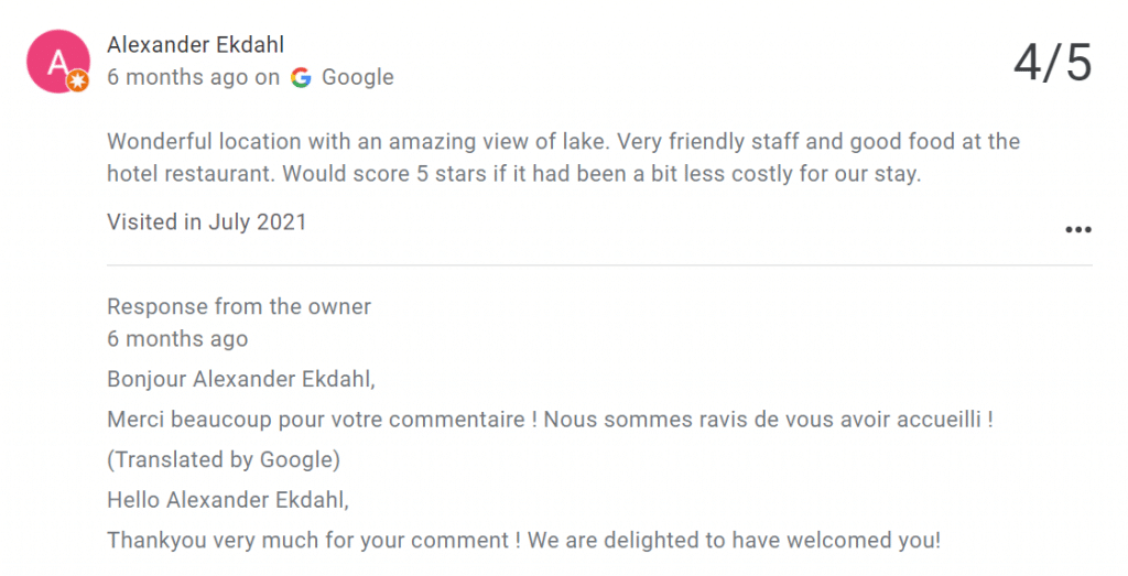 Les avis positifs sont très valorisants pour l’établissement qui le reçoit. De plus, ils permettent de rassurer les potentiels clients et contribuent à améliorer votre e-réputation. Attention toutefois, de nombreuses entreprises choisissent de répondre uniquement aux commentaires négatifs. La réponse aux avis positifs aide pourtant à fidéliser les clients existants. Aussi, n’hésitez pas à laisser un mot de remerciement.
