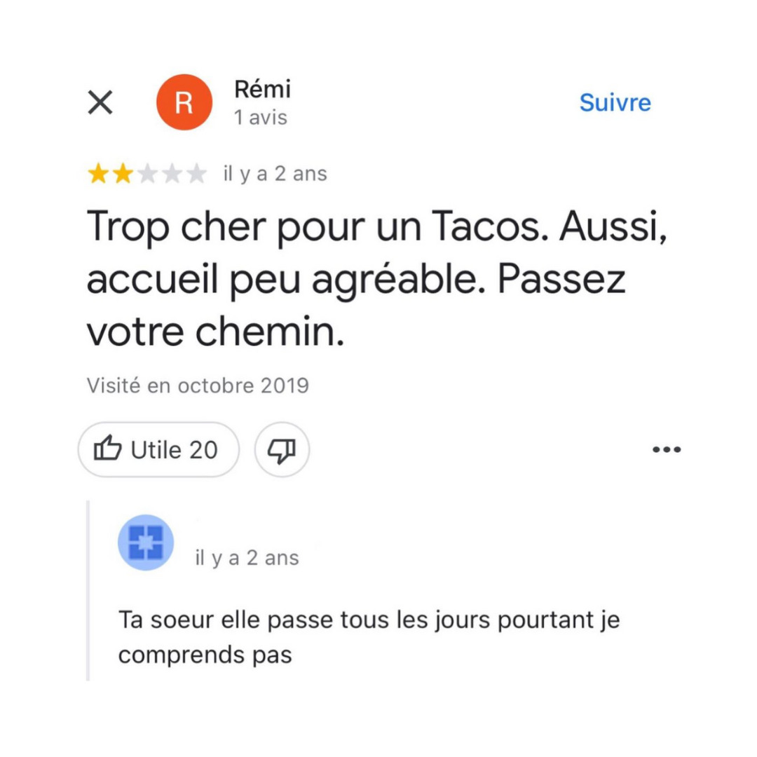 Les avis postés sur ce site sont généralement courts et très directs sans les formules de politesse d’usage. Pour répondre aux avis Google, il vous faudra un compte Google MyBusiness et répondre soit aux avis excellents, soit aux avis négatifs.