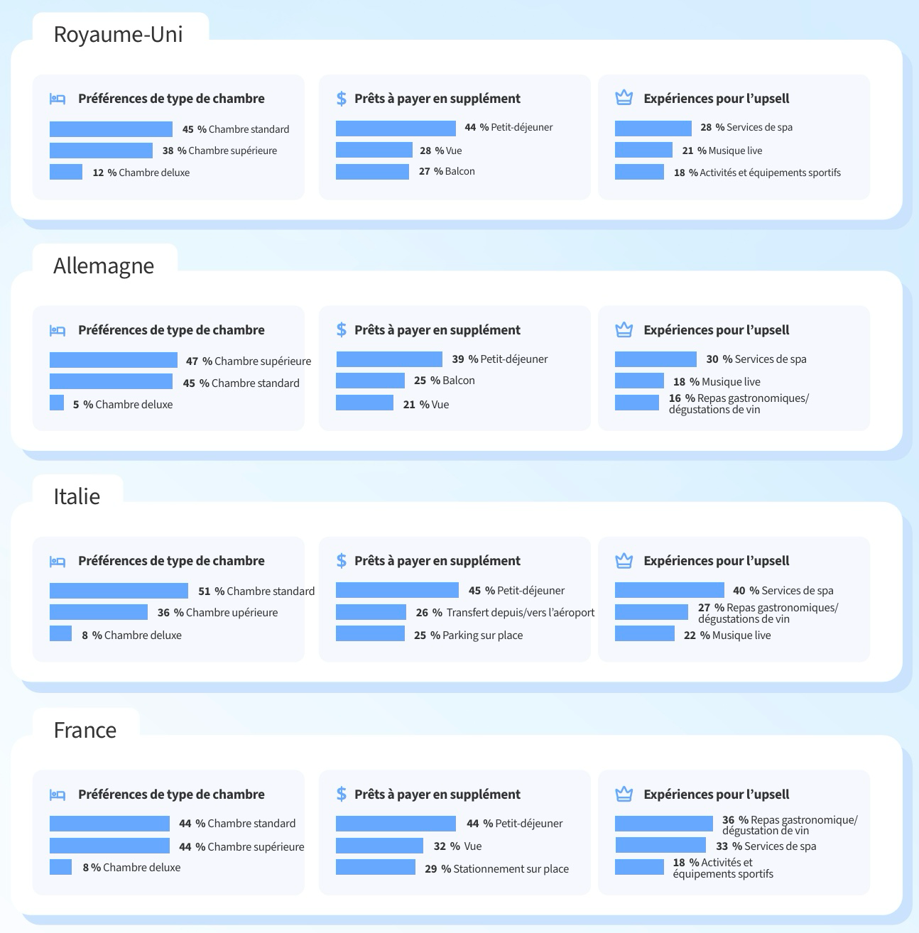 - 58 % comptent choisir une chambre “supérieure” ou “luxe ” (+4 points); soit une remontée de la recherche de qualité dans les priorités des voyageurs. Si tel est le cas pour votre établissement, n’omettez donc pas ces termes dans vos présentations tarifaires en ligne,