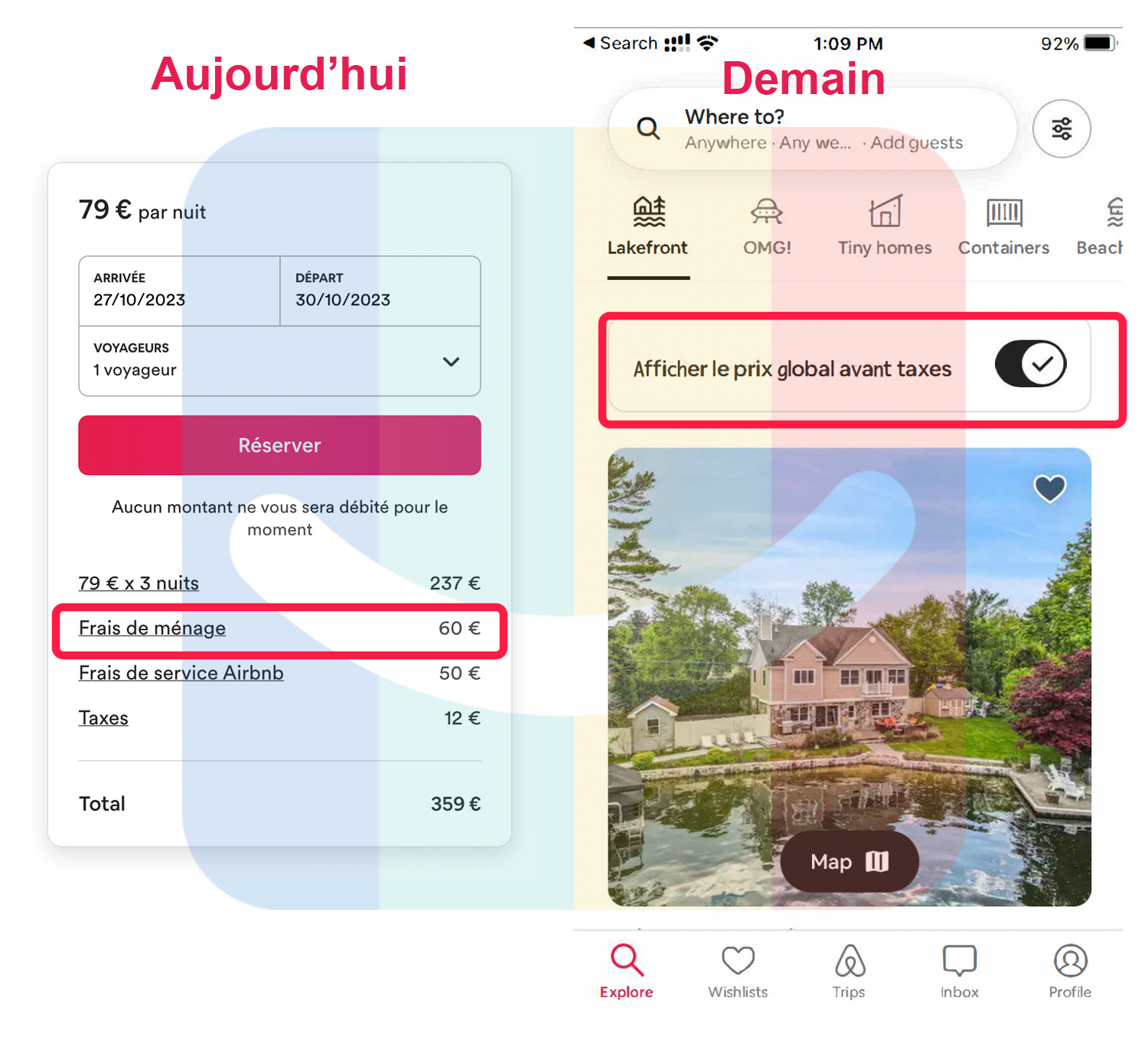 Face à cette montée de température, dans un premier temps, les propriétaires (et certains sites spécialisés) ont donc cherché à rendre cette “option” plus douce en ne la faisant apparaître qu’à la fin du processus de réservation: ==le client voit un prix de base (par exemple, 500€ la semaine), ce qui rend l’offre attractive, puis, au moment de finaliser, s’additionnent des options “obligatoires” (comme le ménage) qui peuvent faire grimper l’addition de quelques dizaines ou centaines d’euros supplémentaires; ce qui est un véritable “irritant” pour le voyageur (qui n’aime, mais alors pas du tout, cela) et pour la plateforme de distribution (qui perd souvent, à cause de cette “mauvaise” surprise) la réservation et donc, la commission. Et donc, un “acte illégal” pour les autorités publiques … qu’elles soient américaines ou européennes.
