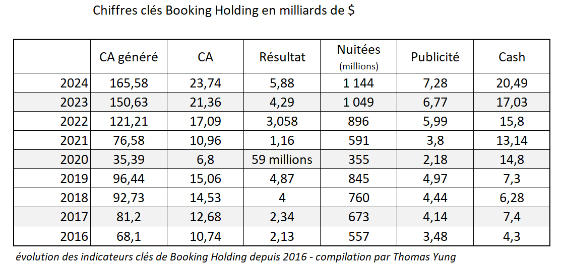 J’emploie le terme « Booking » mais c’est bien les chiffres consolidés de la maison mère Booking Holdings. Les résultats suivants incluent ceux de Agoda, Kayak, etc.