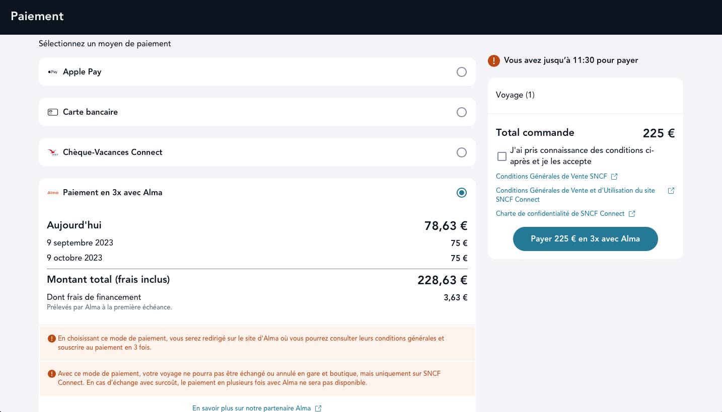 La semaine dernière, discrètement, la compagnie nationale ferroviaire a donc introduit la possibilité de payer son billet de train en trois fois. Et, signe que le “3 x sans frais” n’est pas réservé qu’aux gros budgets de voyage, le site de la compagnie nationale a également étendu cette “facilité” aux voyageurs qui emprutent aussi les bus (FlixBus ou BlaBlaCar Bus) dès 150 euros d’achat. La limite posée par la SNCF est, quant à elle, fixée à 999 euros. Autre fait majeur, la SNCF partage le coût de cette “facilité” avec le voyageur puisqu’elle majore le prix du billet de 1,50% à tout voyageur qui veut en profiter.