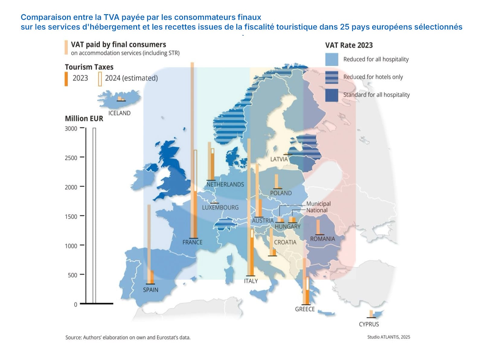 Le rapport alerte aussi sur la montée des taxes touristiques (taxes de séjour, prélèvements locaux comme les taxes additionnelles …), devenues dans certains territoires un levier fiscal majeur … pour des collectivités en mal de financement et, quelquefois, … de justifications. Dans certaines villes comme Amsterdam, par exemple, la somme de la TVA et la taxe touristique pourrait désormais représenter plus de 33 % de la note d’un hébergement d’ici 2026.