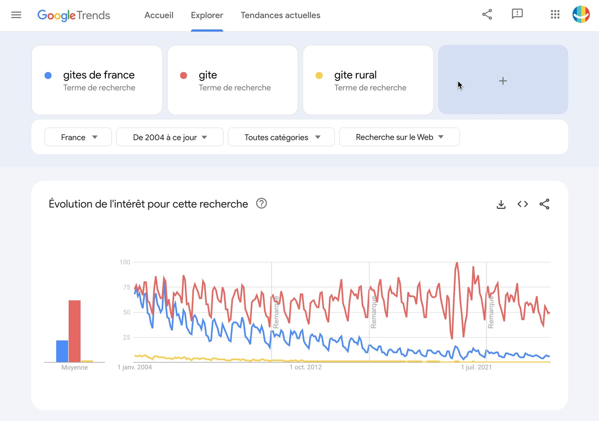 Non, ce qui frappe, c’est le rapport entre l’expression (ou la marque) “Gites de France” et le terme – nu ! – de “Gite”: si la première s’effondre littéralement (avec une pointe au moment du post-covid), le terme “gite” se maintient à des niveaux élevés et démontre une appétence manifeste des français pour ce type d’hébergement.