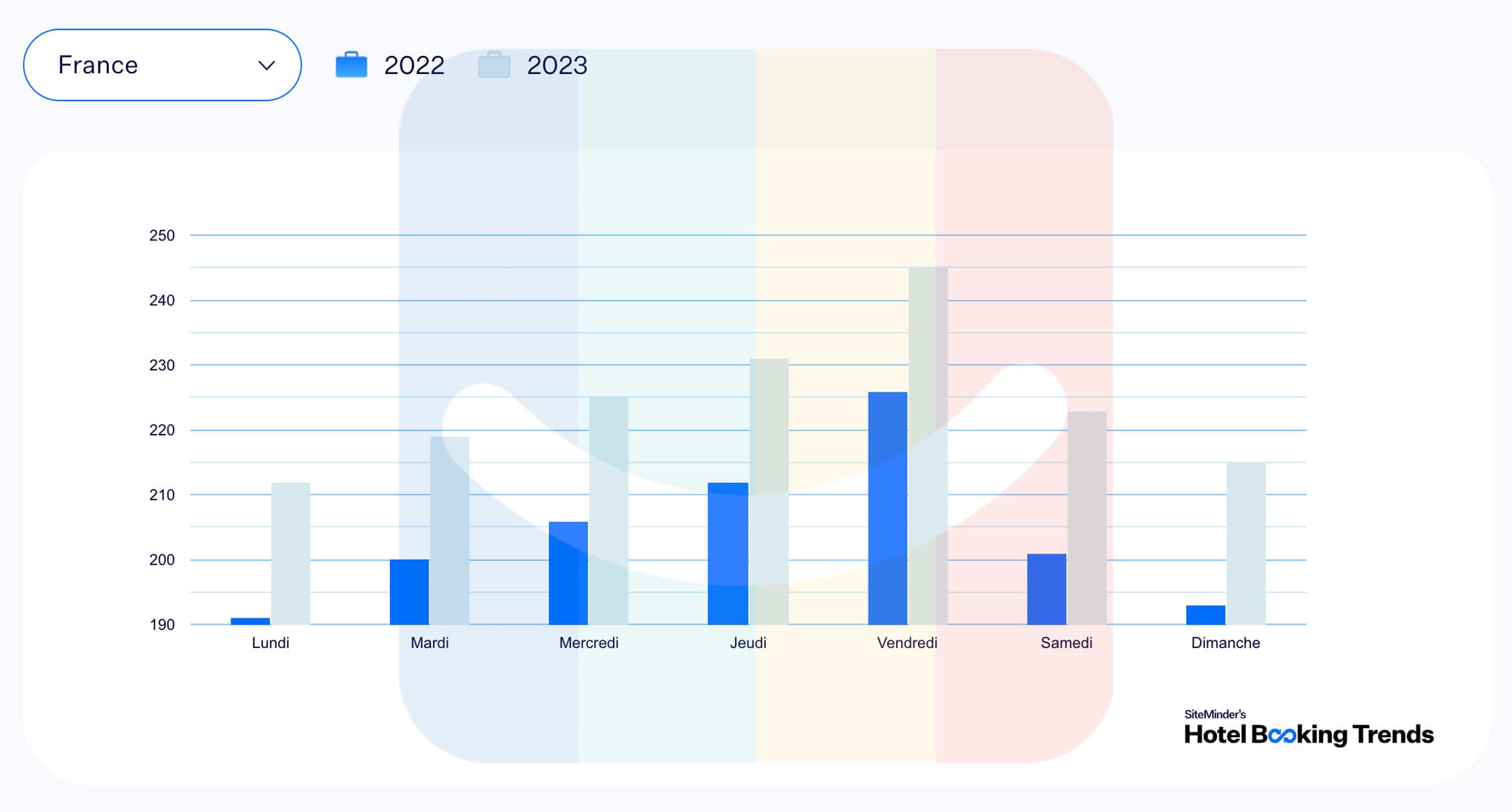 Ainsi, le Booking Hotel Trends 2024 révèle aussi que les hébergeurs français ont décidé de faire varier leurs prix beaucoup plus de fois que par le passé. Ainsi, entre 2022 et 2023, on note une explosion de ces changements quotidiens de prix chaque jour de la semaine ! Là où, historiquement, les prix fluctuaient plutôt entre les jours de semaine et de weekend, désormais, ces prix changent quasiment tous les jours, y compris ceux qui avaient tendance à ne jamais bouger notoirement comme le dimanche et le lundi. L’adaptation de tous les types d’hébergeurs aux principes de l’agilité tarifaire est donc largement enclenchée !
