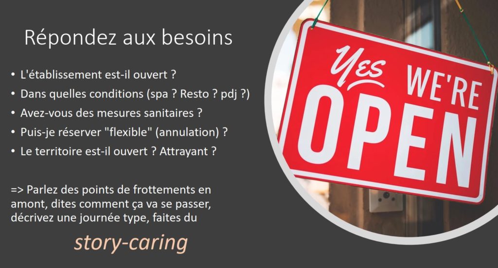 S’il y a un engouement pour les vacances, c’est que le besoin est fort. Je vous passe les besoins de nature, de se retrouver, de profiter, de se reposer, etc.. Il y a eu une modification profonde des besoins, attentes et comportements des voyageurs/vacanciers. J’espère sincèrement que vous avez pris ces changements en compte, sinon il va y avoir un décalage entre ce que votre client recherche/attend et ce que vous allez délivrer comme prestation.