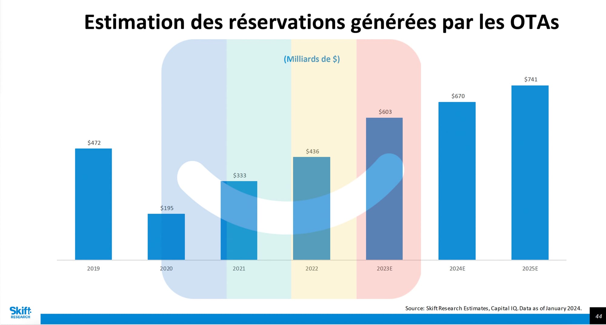 En cédant du terrain à une époque de plus en plus stratégique (inflation oblige), ces hébergeurs abandonnent la vente de première intention aux OTAs et ne font qu’accélérer la mutation estimée par Skift (voir ci-dessous) sur la croissance fulgurante de leurs revenus pour les prochaines années …