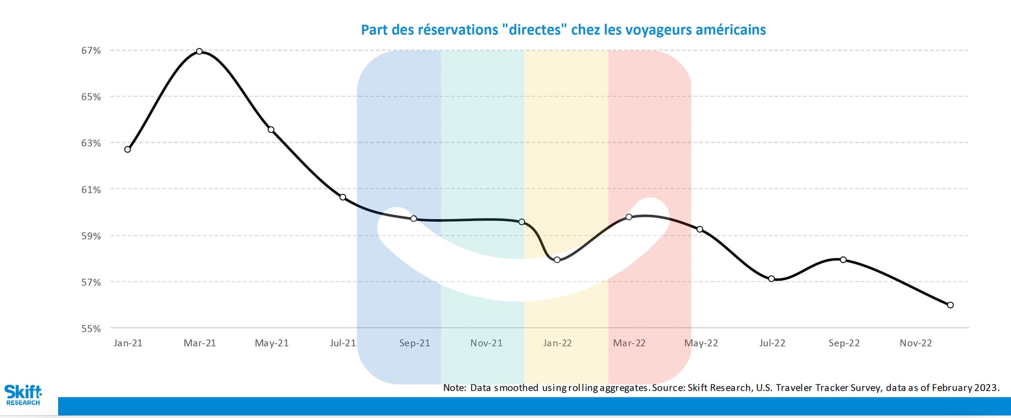 Aux US (voir graphique ci-dessous), alors que les voyageurs avaient privilégié les réservations directes au moment du covid (pour obtenir de meilleures garanties de l’hébergeur “en direct”, mais aussi parce que les OTAs avaient manifesté un retrait marketing inédit), ces derniers ont repris progressivement le chemin des OTAs au fur et à mesure que les prix montaient et qu’il leur devenait de plus en plus urgent de “faire jouer la concurrence” pour optimiser leur budget voyages.