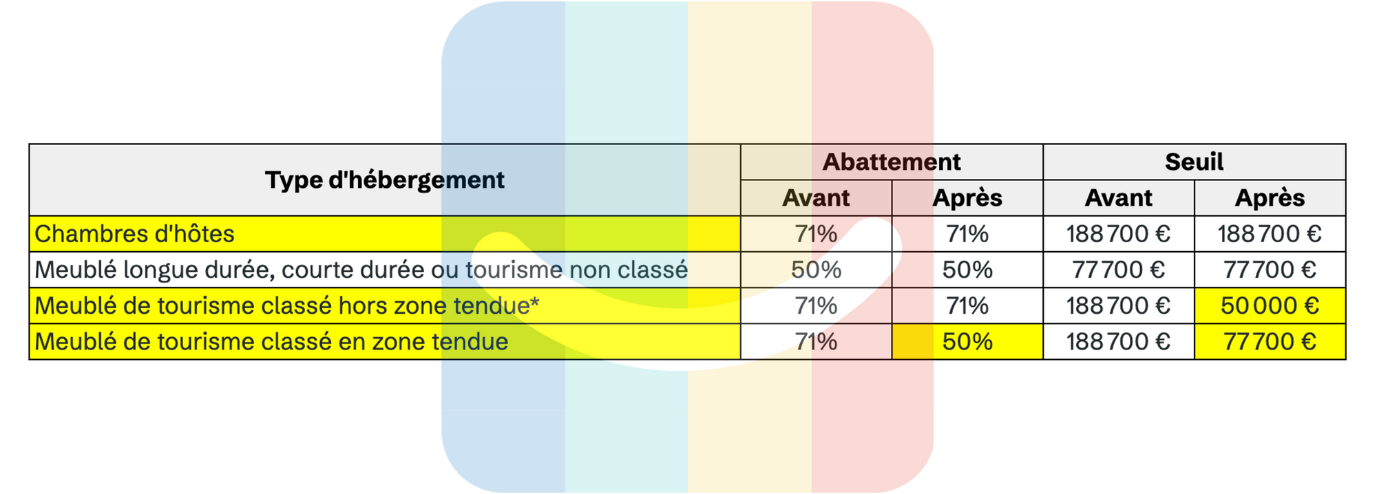 Pour les meublés de tourisme “hors zone tendue”, ces derniers pourraient bénéficier d’un abattement supplémentaire de 21% jusqu’à 50 000€ de chiffre d’affaires. Dans le cas où le seuil de 50 000€ serait dépassé, le propriétaire ne pourrait pas bénéficier de l’abattement supplémentaire de 21%: il resterait donc “scotché” à un abattement de 50%.