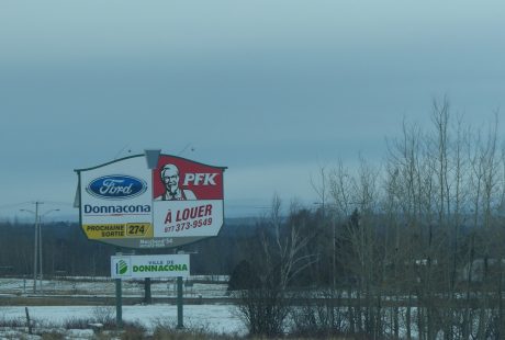 On trouve les enseignes de fast-food habituelles, comme McDo, Burger King, Starbucks, PKF (c’est KFC, mais ici on dit Poulet frit à la Kentucky), Tim Horton, Five Guys, etc.